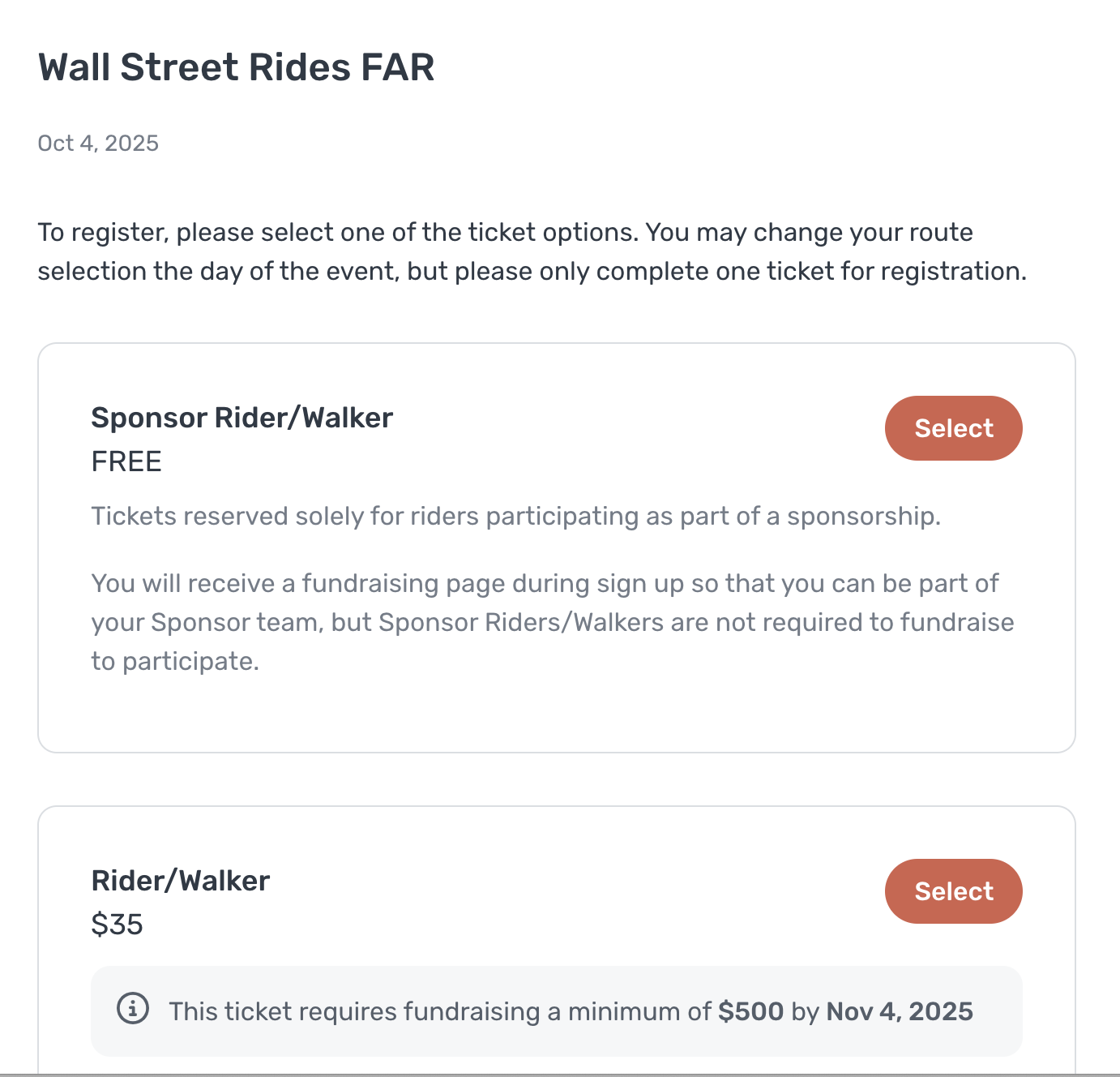 The first step is to sign up! There are two ticket options. For riders afflitled with a sponsor, please select the "Sponsor Rider/Walker" ticket. Riders participating outside of a sponsorship should select the "Rider/Walker" ticket.